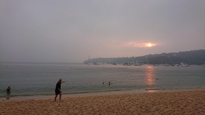 A real smoky one this morning…..& capturing Chris directing us all towards the water for our swim. A reflection of tough times still in the bush.
