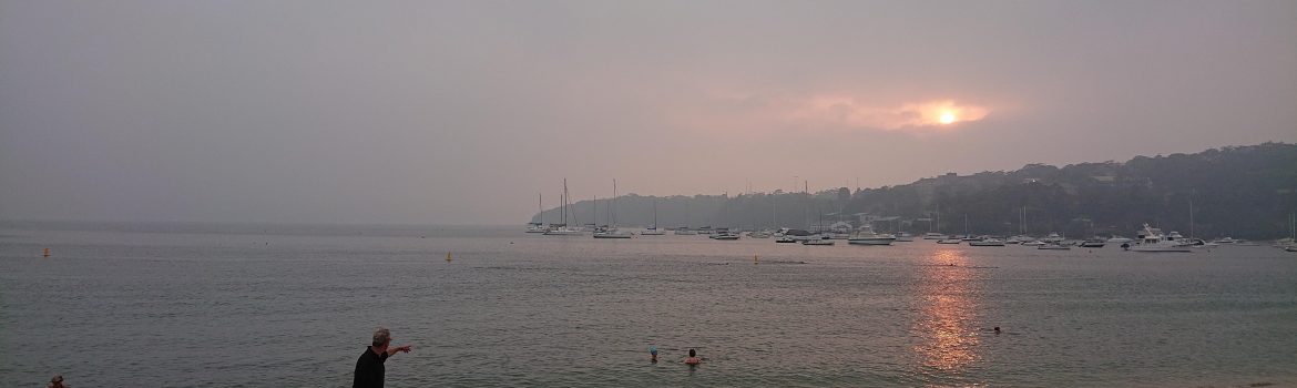 A real smoky one this morning…..& capturing Chris directing us all towards the water for our swim. A reflection of tough times still in the bush.