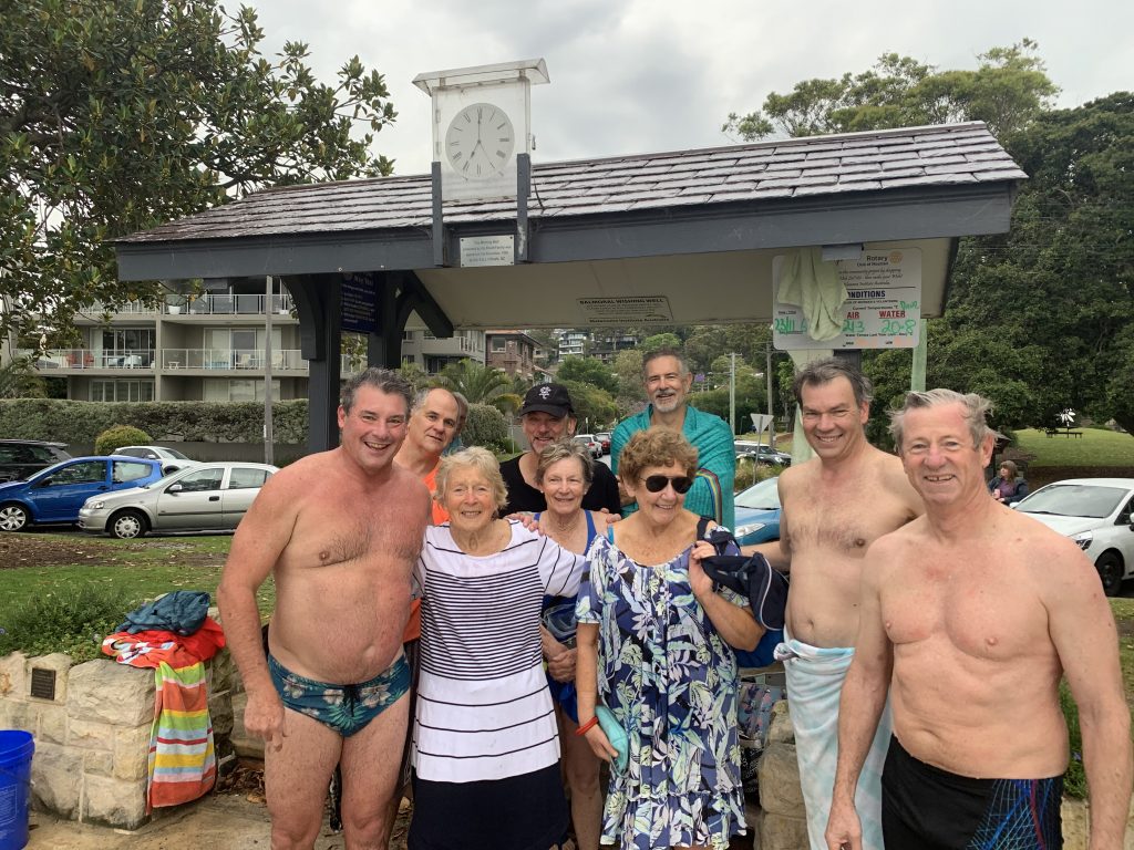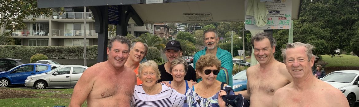 A terrific turn-out to welcome Matt McGuire back and RBJ Day 3. Robyn left a little earlier with the most beautiful & obedient green eyed kelpie (as she said…if only kids could be trained so well). Ruth, Meg (more oranges please) and Chrissy adding some calendar girl flavour to the photo, whilst Linda was busy & out of view hugging a dog near the steps….surprise surprise. Chris M. was checking he had film in his camera & SBJ taking the snapshot. ‘Ole Robert is in the background believe it or not…you can see him just behind Dave’s left ear… Sutho’ was still swimming of course but around too. Elkie just missing the photo op.